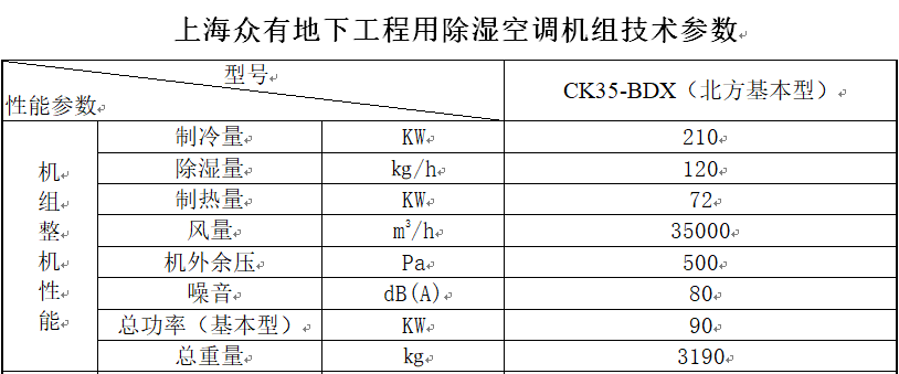 本設計方案選用了我司自主研發的CK35-BDX地下工程用除濕空調機組,共含主機段、送風機段、空氣處理段、混風過濾段,每一個環節都選用上等材質,確保性能。