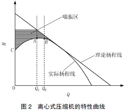 由于離心式制冷壓縮機的葉輪都是后向型,β2 <π/2,所以理論揚程曲線是一條單調遞減的直線;考慮壓縮機的損失,包括機械損失、容積損失、摩擦損失、沖擊渦流損失等,離心式制冷壓縮機的理論性能曲線和實際性能曲線如圖2所示。其中A 點為實際揚程最高點。機組運行在0到QB 區(qū)域內,QA 點的附近是最佳工作區(qū)。高于實際揚程線的外部區(qū)域就是喘振區(qū)域。
