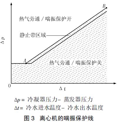 機組通過本機集總控制裝置(PIC)監(jiān)測壓縮機電機的電流來判斷機組是否進入喘振工況。一旦機組電流的波動幅度超過一定值(默認是25%,也可以通過控制面板LID設定)達1s,控制系統就會記下一次喘振。如果在設定時間段內( 默認是5 min) 這樣的波動達到12次,控制系統就認為機組運行進入了喘振工況, 機組就會停止運行并報警(EXCESSIV E COMPR SU RGE)。這樣就對機組進行了保護,防止喘振對機組的損壞。此外,還可以通過可選配件-熱氣旁通閥,當機組將要進入喘振工況時打開熱氣旁通閥來改善機組的工況,達到對機組的喘振保護。